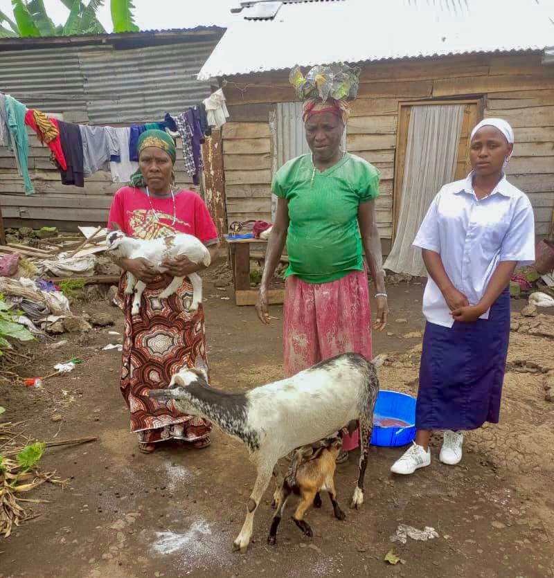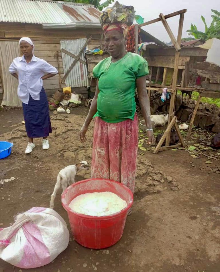 Baraka Bakanga, die als dierenarts veel vrijwillige ondersteuning geeft, bezocht onlangs één van de vrouwen in de wijk Mugunga. Marceline Ndabugi Katoto, die weduwe is, is ook begonnen met de verkoop van maniokmeel. Hoe dat mogelijk was? Dankzij de verkoop van één van de geitjes die haar geit op de wereld had gezet. Het geitenproject stelt Marceline ook in staat om haar dochter, Mugoli Katembezi, naar school te laten gaan.